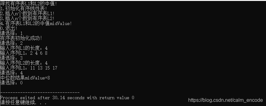 cout<<"4.有序表L1和L2的中值midValue!"<<endl;