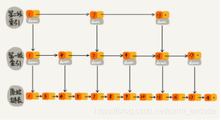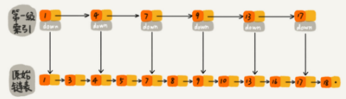 为了提高查询效率,我们对链表建立一级"索引",查找起来就会快一些,每两个结点提取一个结点到上一级,我们将提取出来的那一级叫做索引或索引层。同时增加指向下一级结点的指针down。