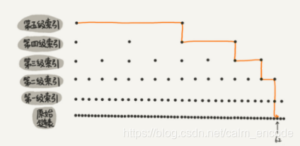 如在包含64个结点的链表中,在我们建立五级索引之后,我们查询62的效率会从没有索引的遍历62个结点到拥有五层索引后遍历11个结点,查询效率提高的比较明显。由此可知,随着数据量的增加,跳表的查询效率会提升的非常明显。