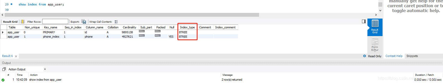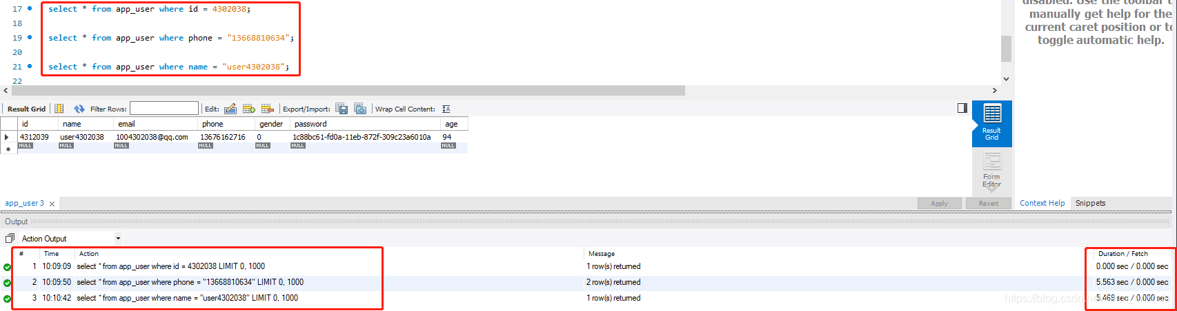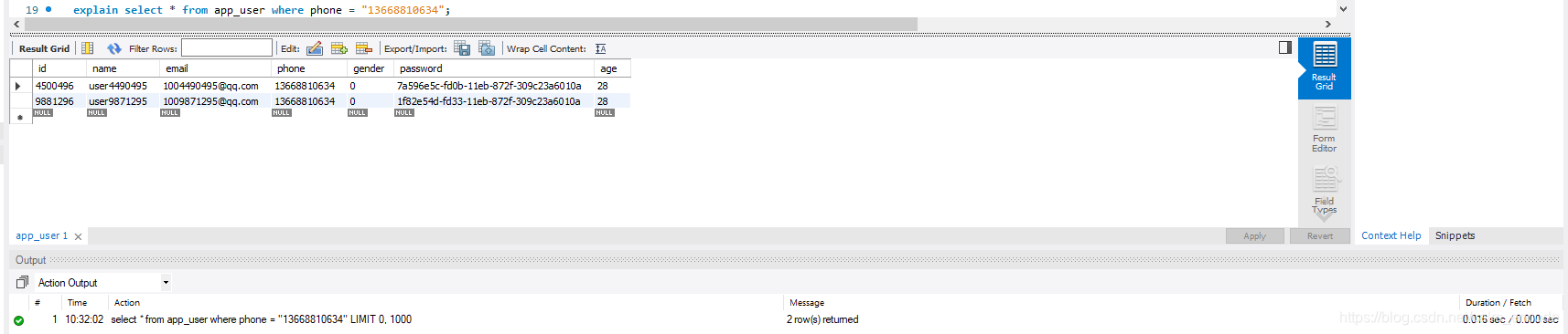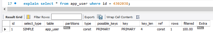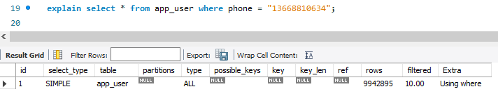 根据分析可知,逐渐查询只查询了一条数据,而根据不含索引字段查询则进行全表扫描,查询了9942895行。