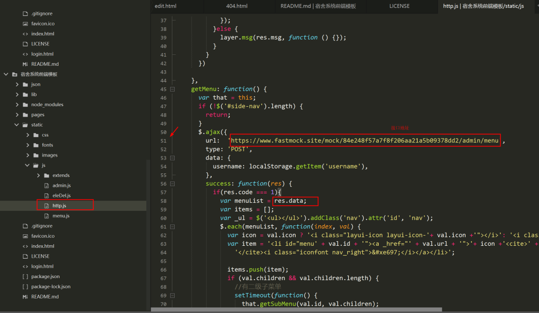 3.2 修改http.js文件,将接口地址填入url键中,并修改menuList变量值