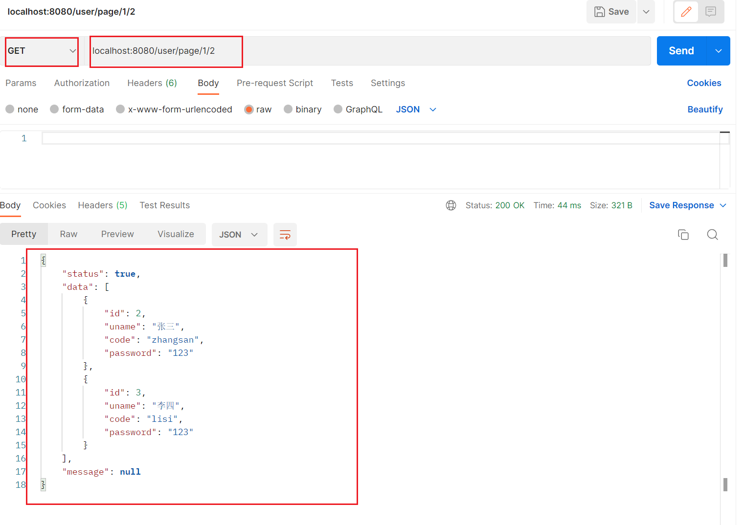 使用Get方式分页查询用户信息(查询第一页,每页显示2条数据)