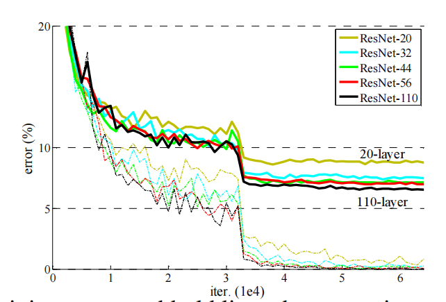 ResNet论文提出了 residual结构(残差结构)来减轻退化问题,下图是使用residual结构的卷积网络,可以看到随着网络的不断加深,效果并没有变差,而是变的更好了。(虚线是train error,实线是test error)