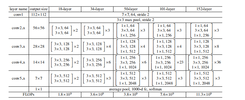 下图是论文给出的不同ResNet网络的层数需求:
