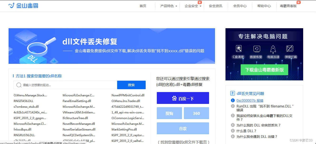 dll下载专区,金山毒霸免费提供各类dll文件下载,帮您解决文件丢失导致“d找不到”的系统错误问题——金山毒霸dll下载,缺少或丢失dll系统报错怎么解决?金山毒霸免费提供各类dll文件下载,帮您解决文件丢失导致“dll找不到”的系统错误问题