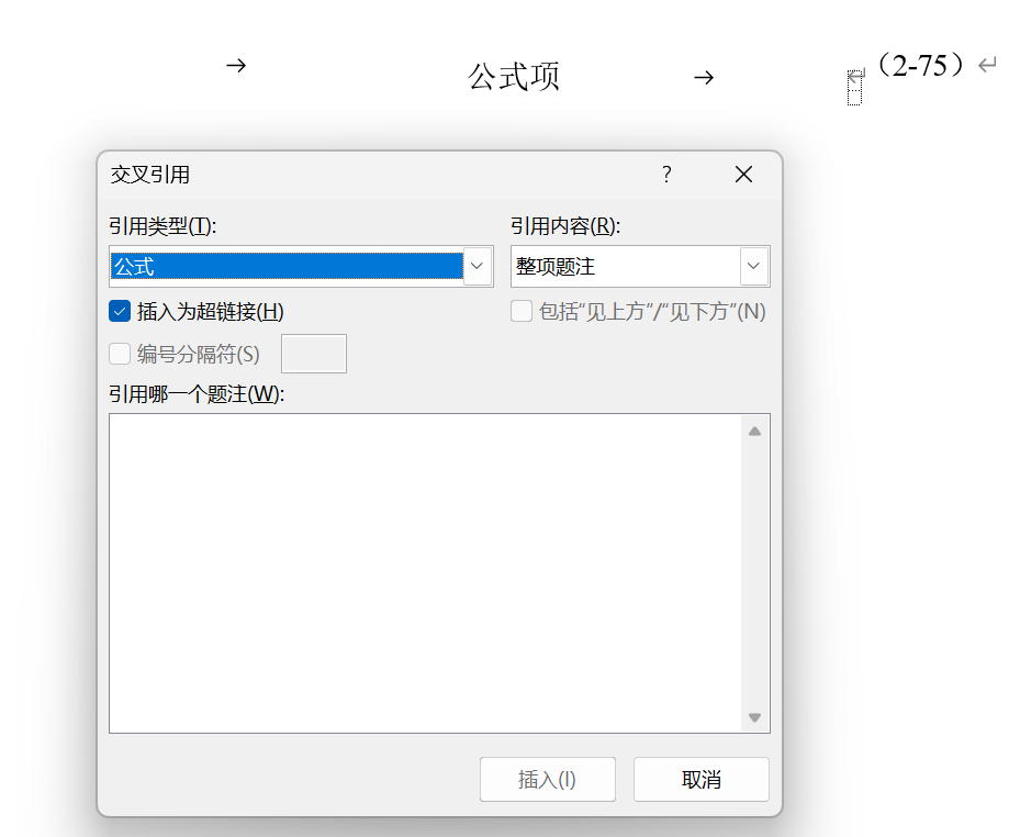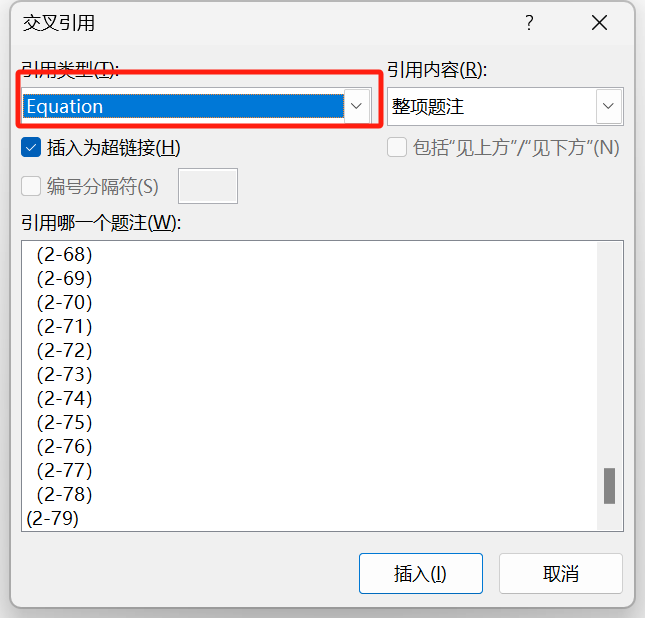 step6:此时点击交叉引用,找到Equation项,即可进行交叉引用。