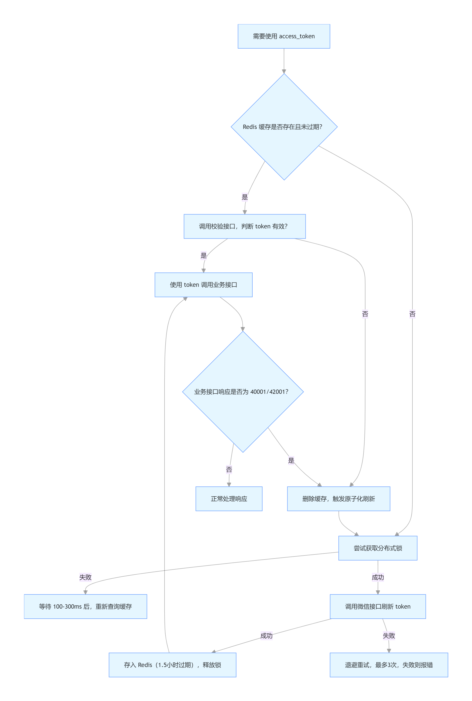 微信服务号的 access_token 存在多实例 / 多调用方共享、被其他调用方刷新后导致本地缓存提前失效的核心问题(官方明确:新 access_token 生成后,旧的会立即失效,而非等 2 小时过期)。处理的核心思路是:放弃 “固定 2 小时缓存”,改为 “主动校验有效性 + 原子化刷新 + 容错降级”,确保缓存的 access_token 始终可用。