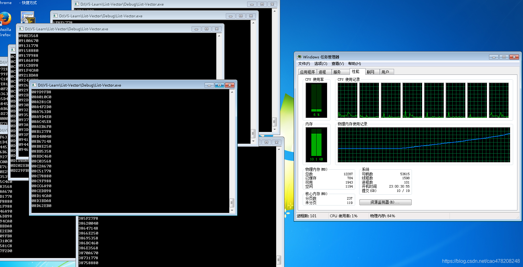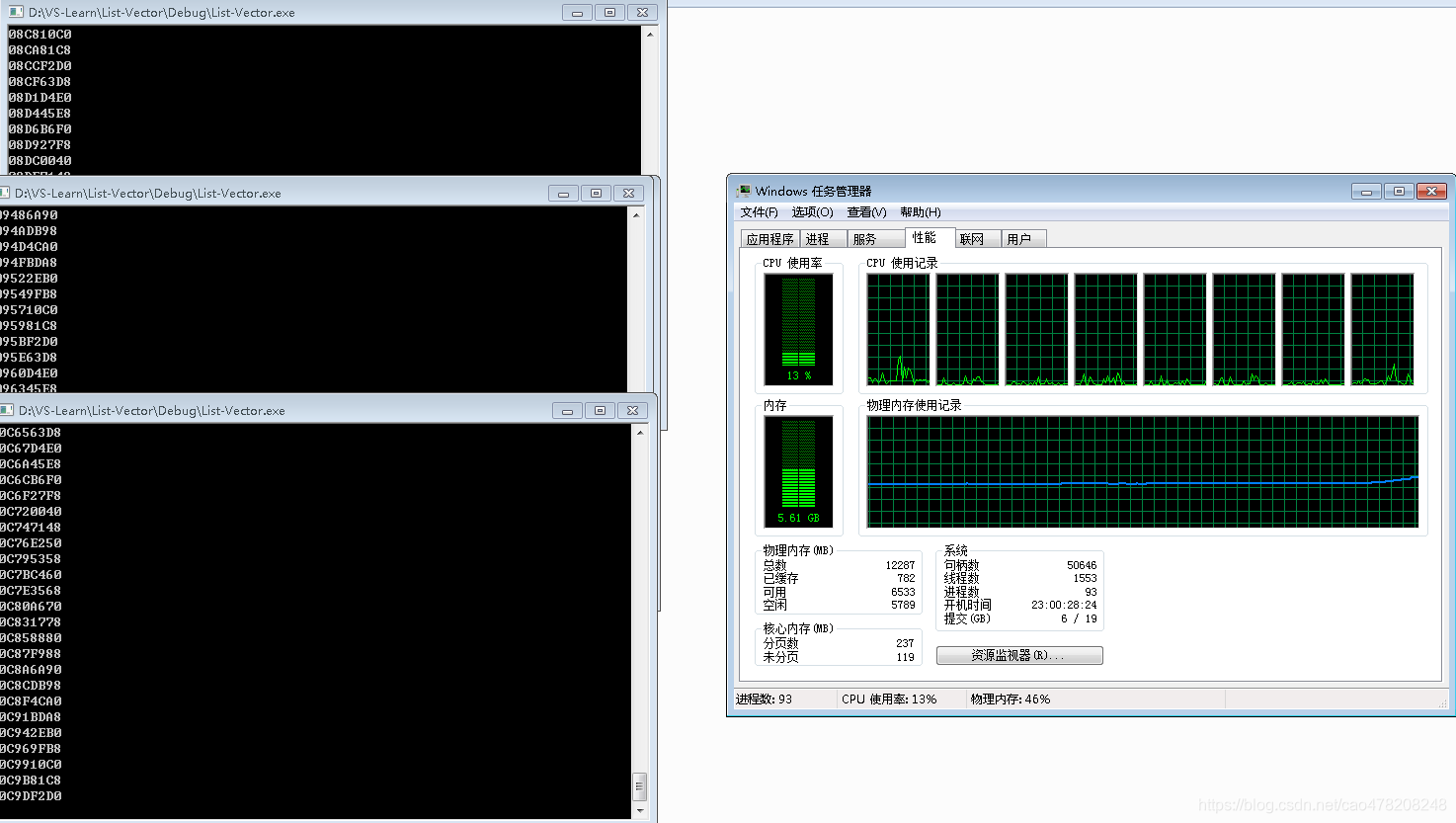 测试的机器用VS2010,内存空间是12GB,windows系统,下面通过任务管理器的内存监控来看内存变化。
