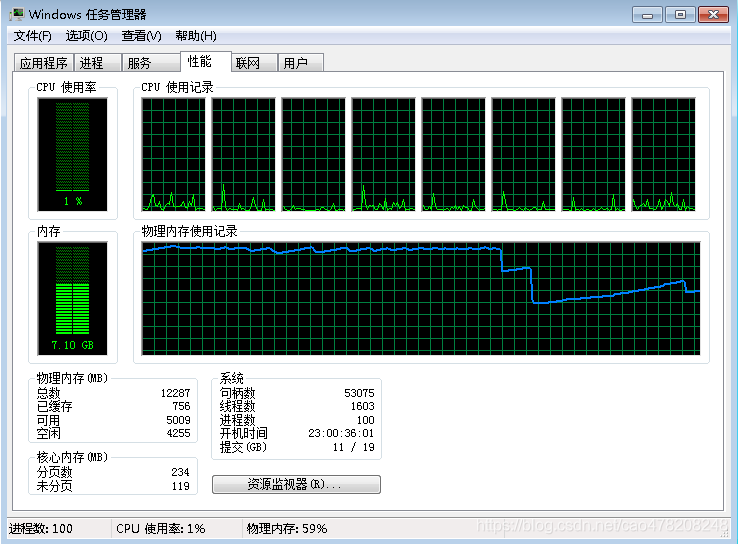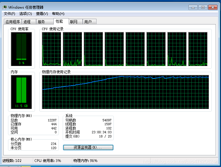 下图是刚开启多个测试程序,物理内存在10几秒内增加到46%,