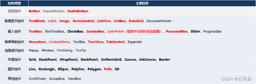 尺寸(宽高)、定位(Margin,HorizontalAlignment、VerticalAlignment)、颜色(Background、Foreground)、信息显示(Text、Content、ListViewItem、ListBoxItem、DataGridTextColumn…..)