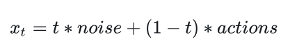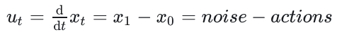 模型的主要思想为流匹配,模型拟合出噪声->动作(目前看来是动作->噪声反向拟合了)的运动趋势,即: