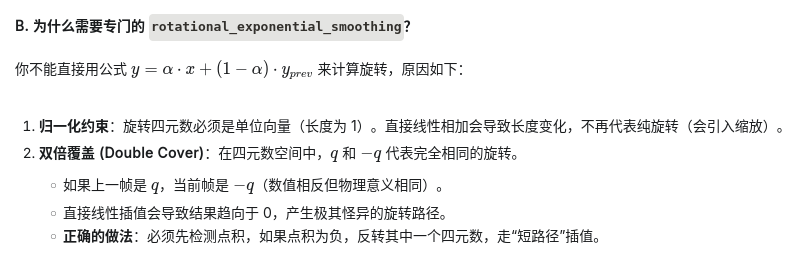 因此,代码中调用的 rotational_exponential_smoothing 内部通常实现的是 NLERP (Normalized Linear Interpolation) 或 SLERP (Spherical Linear Interpolation)。