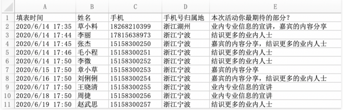 每位报名者提交信息后会形成一条数据,最终可形成如下所示的数据表格,统一管理客户线索:
