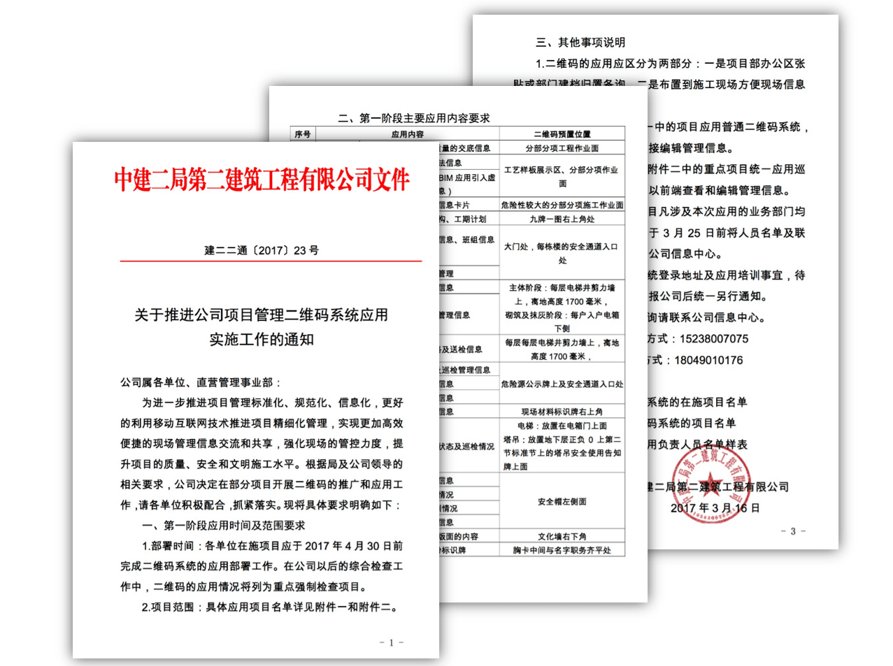 中建二局二公司印发了《关于推进公司项目管理二维码系统应用实施工作的通知》(下称“通知”),以中建二局第二建筑工程有限公司成为试点,率先推广全面应用二维码进行施工管理。根据通知要求,列入试点范围的在施项目需全部完成二维码系统的应用部署工作。而公司也将在综合检查工作中,将二维码的应用情况列为重点强制检查项目,目前中建二局二公司已有44个项目正式上线使用。