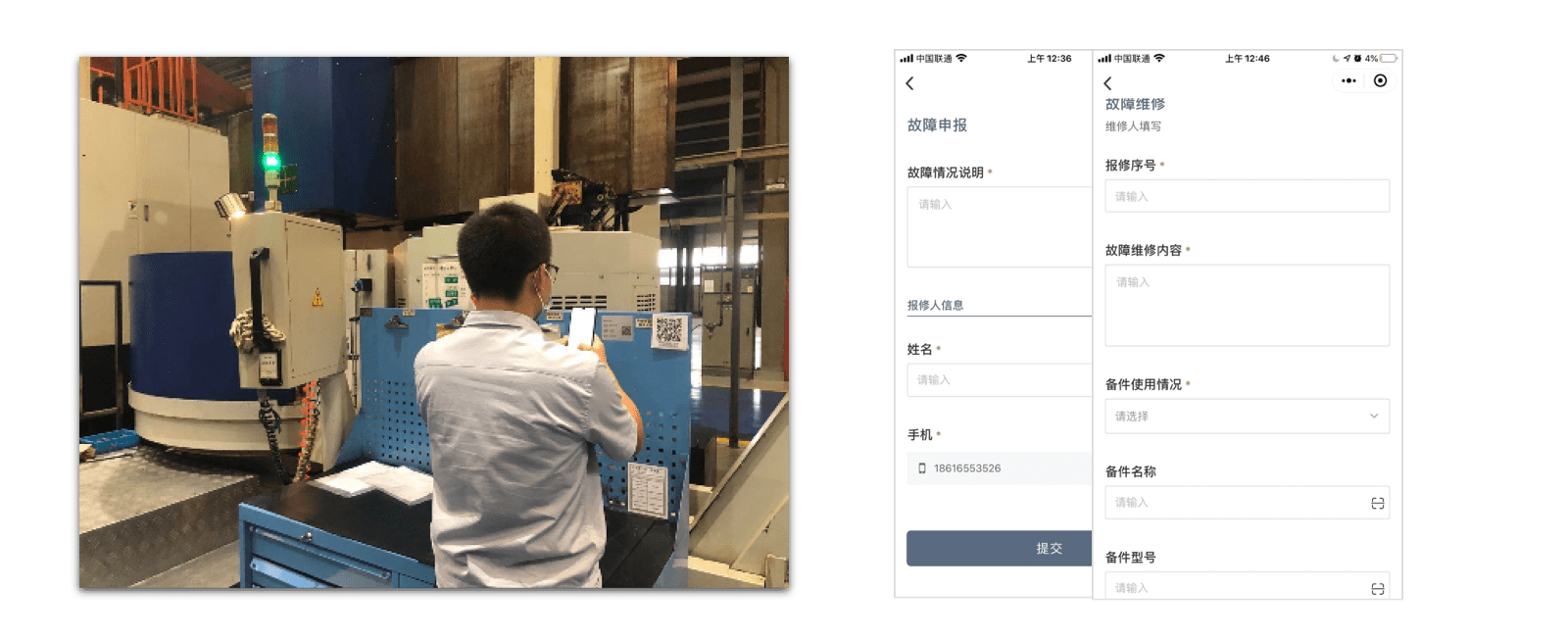 在设备上粘贴专属二维码,现场人员可以随时扫码上报故障。在完成上报后,系统将自动发送微信消息提醒负责人,负责人查看故障内容后,可以及时派维修人员到现场进行维修,随后再记录维修情况。