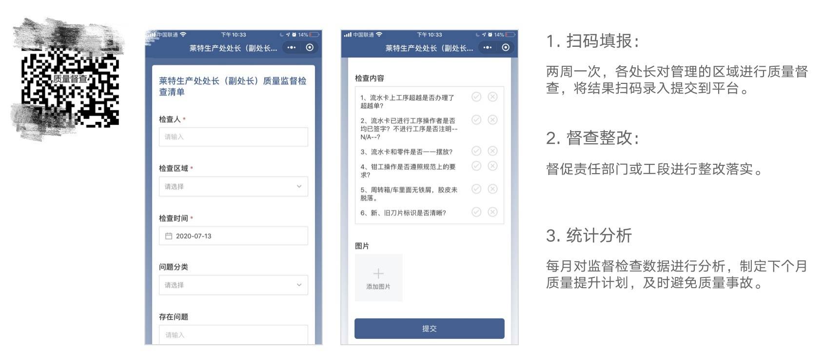 负责质量督查的人员定期对现场进行巡查,发现质量问题时可以实时扫码填报,同时推送至责任工段或部门完成整改,还可以在后台对整改数据进行统计分析。
