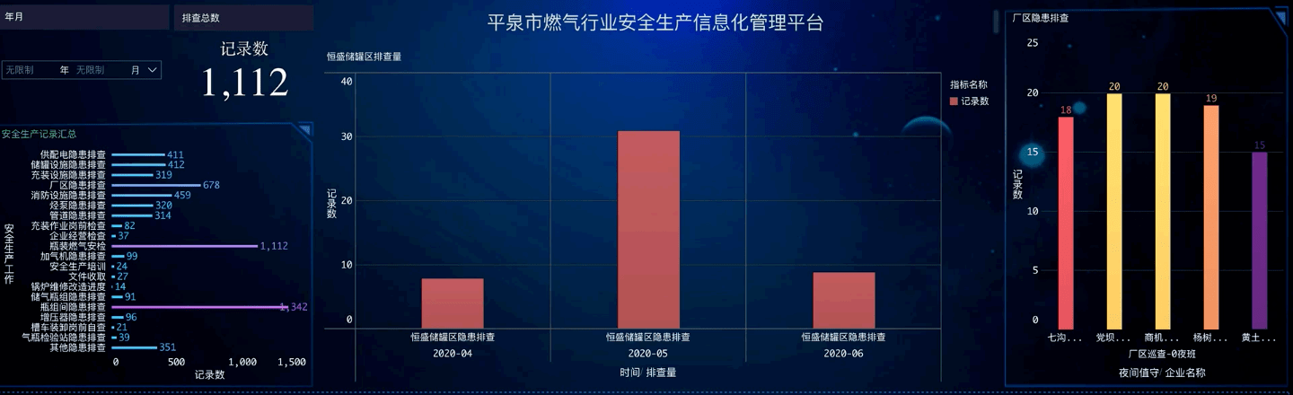 目前平泉市燃气监管平台已完成企业建章立制监管、风险管控隐患排查、日常生产巡查巡检、一线员工操作自查、燃气用户安全检查、值班值守制度落实、从业人员安全教育、应急预案演练记录、安全隐患整改验收8⼤模块,200余小项,基本实现企业经营全流程监管,有效规避以往监管部门现场检查中存在的企业应付检查现象,确保生产经营单位安全生产工作的真实性和时效性,从根本上杜绝了弄虚作假的可能。通过对相关权限设定,实现了企业自查汇总,部门数据统计,领导实时查阅的垂直监管,既规范了企业日常管理,又提高了行业主管部门的监管效率。