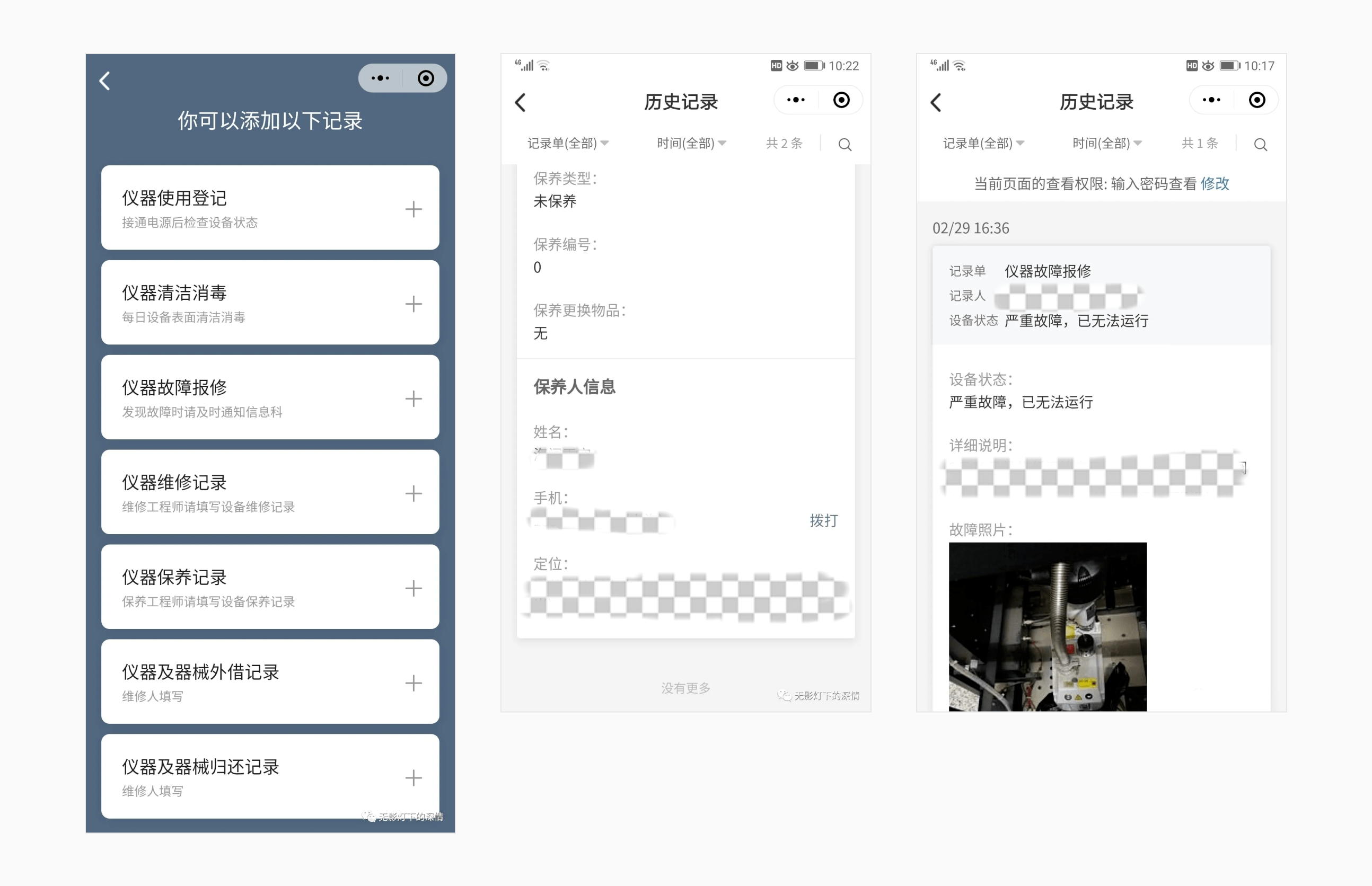 在填写仪器清洁消毒、仪器故障报修等表单时,需要上传照片进行佐证,可以通过限制地理位置、只允许现场拍照,不允许从相册上传,所拍摄的照片会自动带上时间水印等方式来确保所上报数据的真实性。