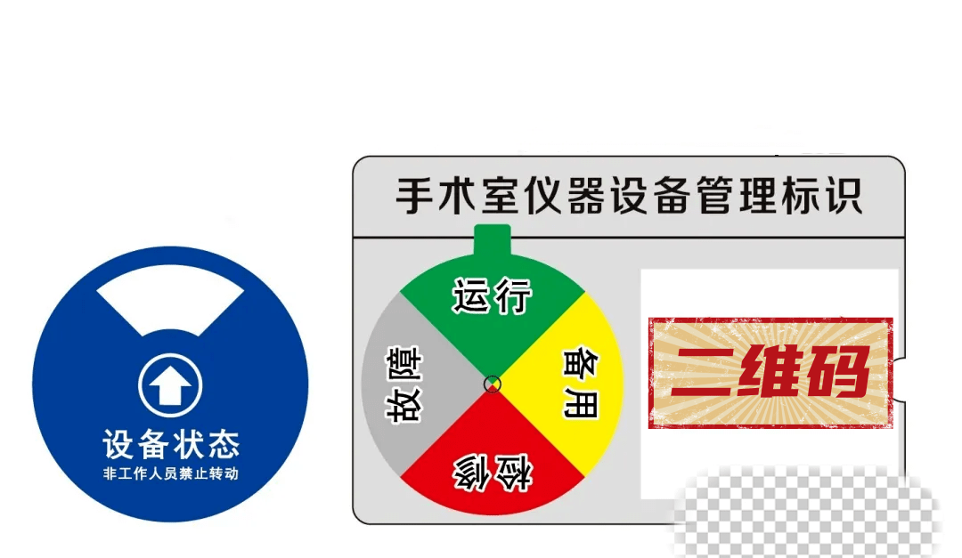 在制作二维码标识牌时,为了更具直观性,可以额外设置一个可调节圆盘,设备巡查人员对仪器状态进行检查并扫码填写相关记录后,可转动圆盘到相应的状态,这样一来医护人员通过圆盘便能清楚明确仪器的设备状态。