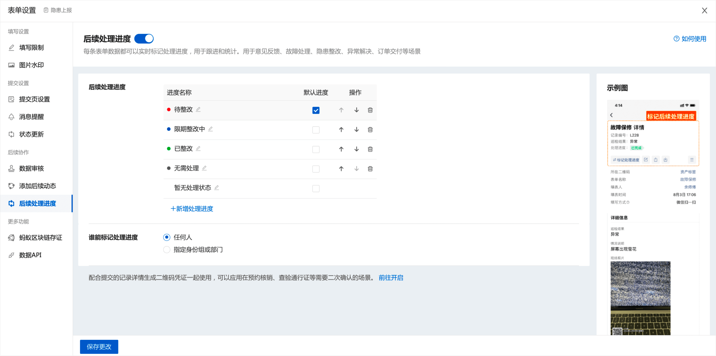 对业务表单进行设置,开启后续处理进度功能,对于处理进度流程进行标记,如“待整改”、“已整改”等。设置默认处理进度为“待整改”。