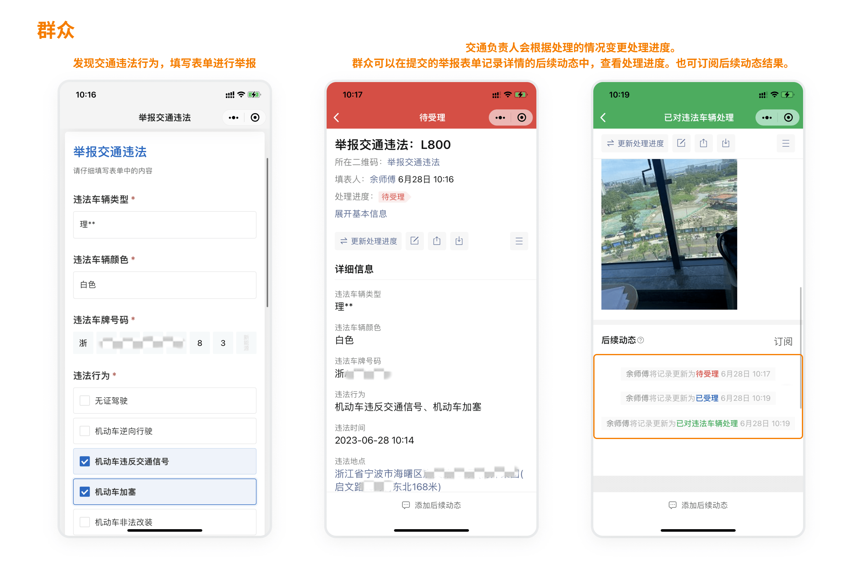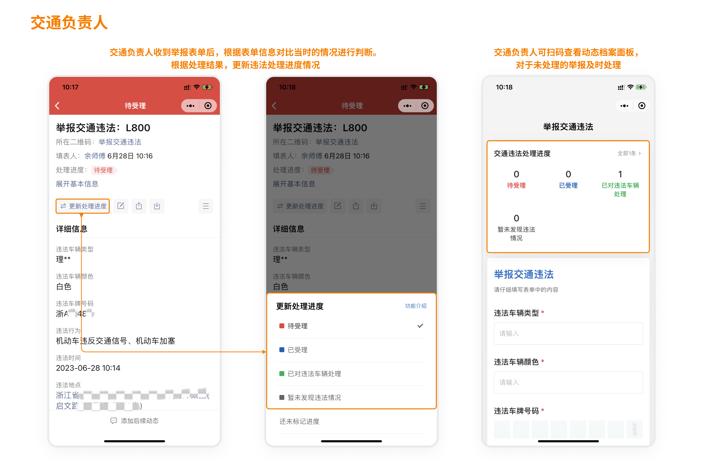 ● 交通负责人收到举报表单后,根据提交内容,对比实际情况判断是否违法并更新处理进度,如:已对违法车辆处理;