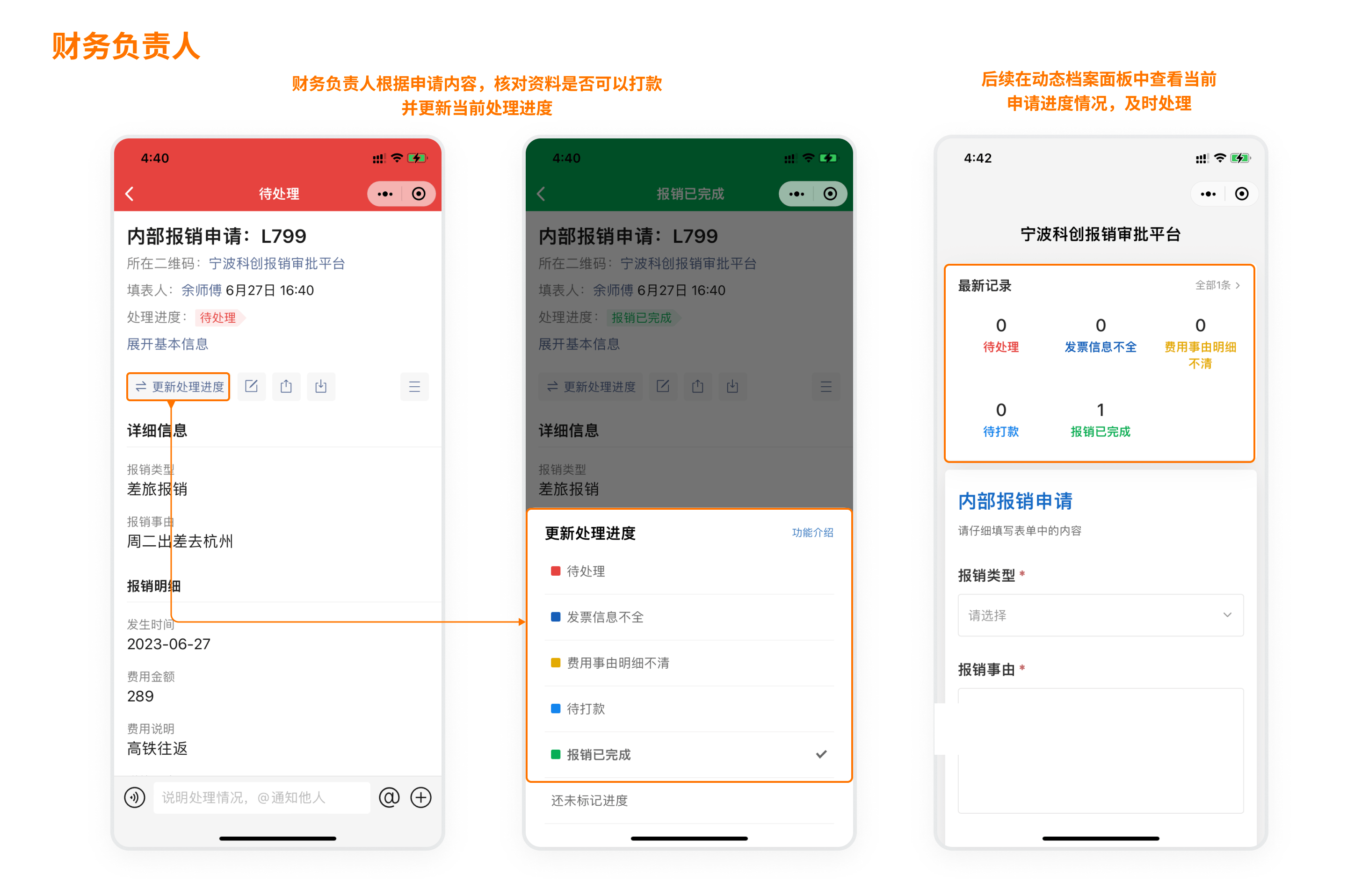● 财务负责人收到申请后,根据提交内容,判断是否可以打款报销。根据情况更新当前处理进度,如:报销已完成;