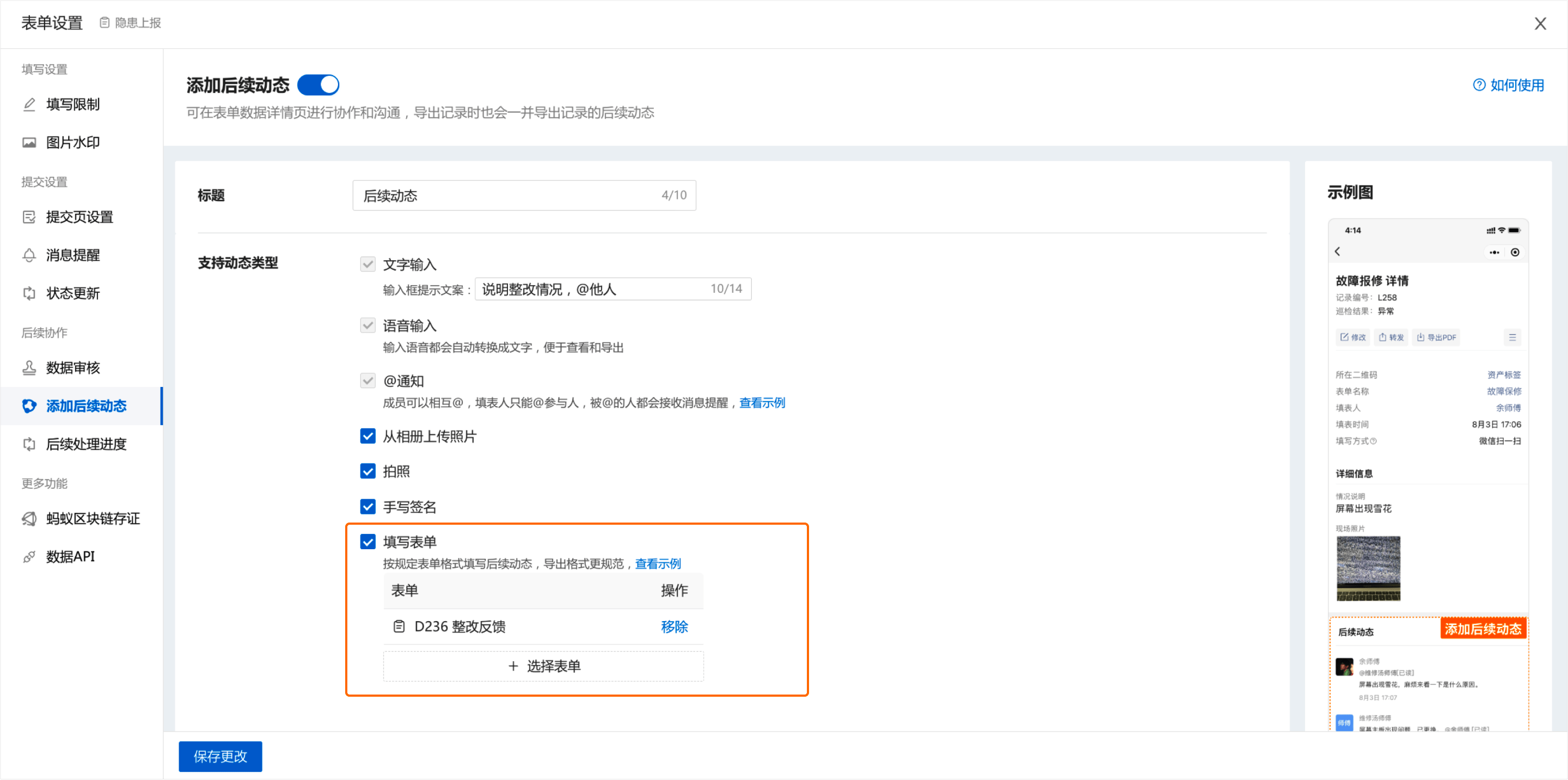 对业务表单进行设置,开启添加后续动态功能。相关人员可以在提交的记录详情页进行协作和沟通,支持图文、@提醒、拍照等方式。