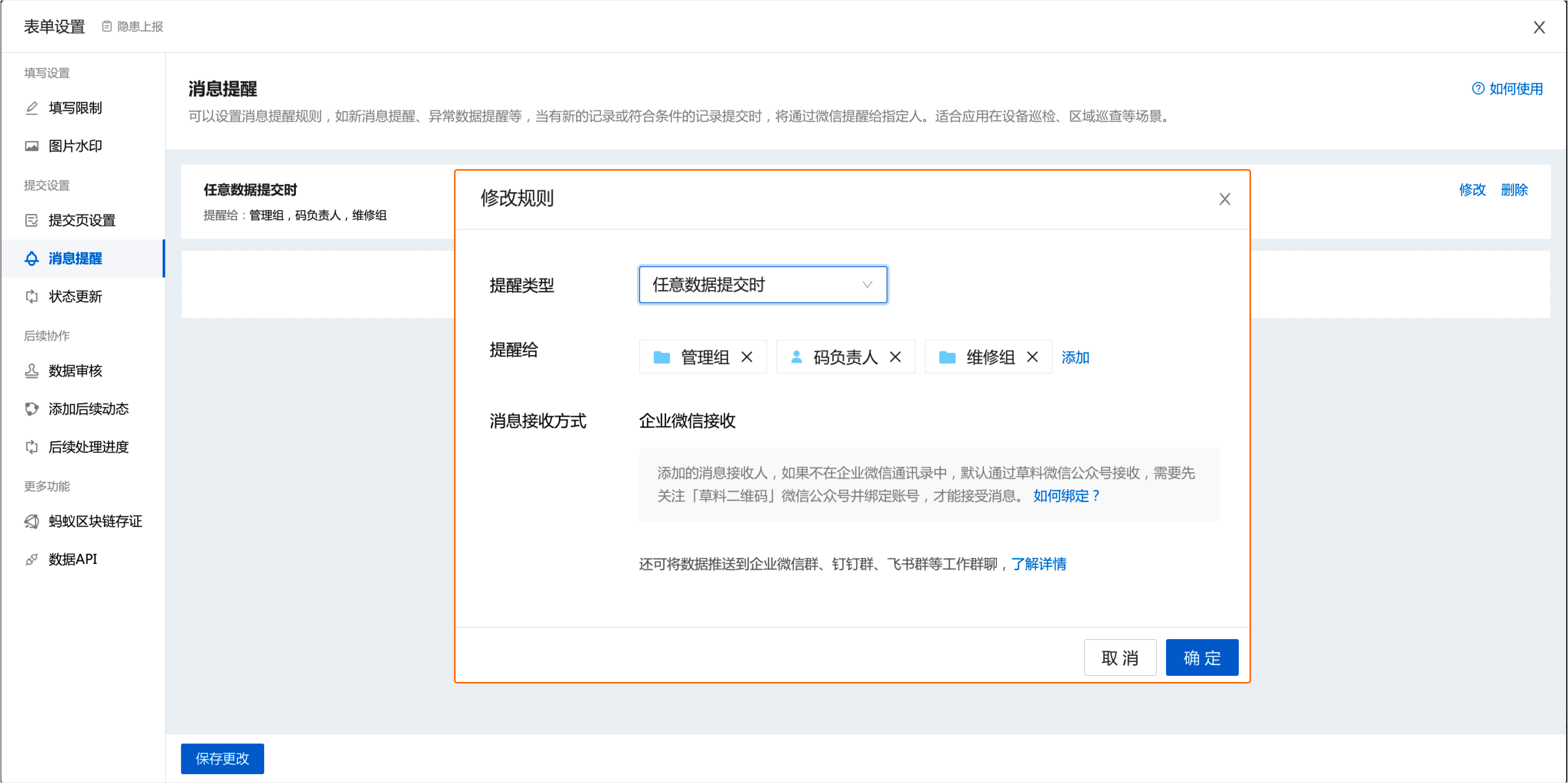 也可以设置提醒类型,即新记录中有满足条件的数据提交时,才会提醒。