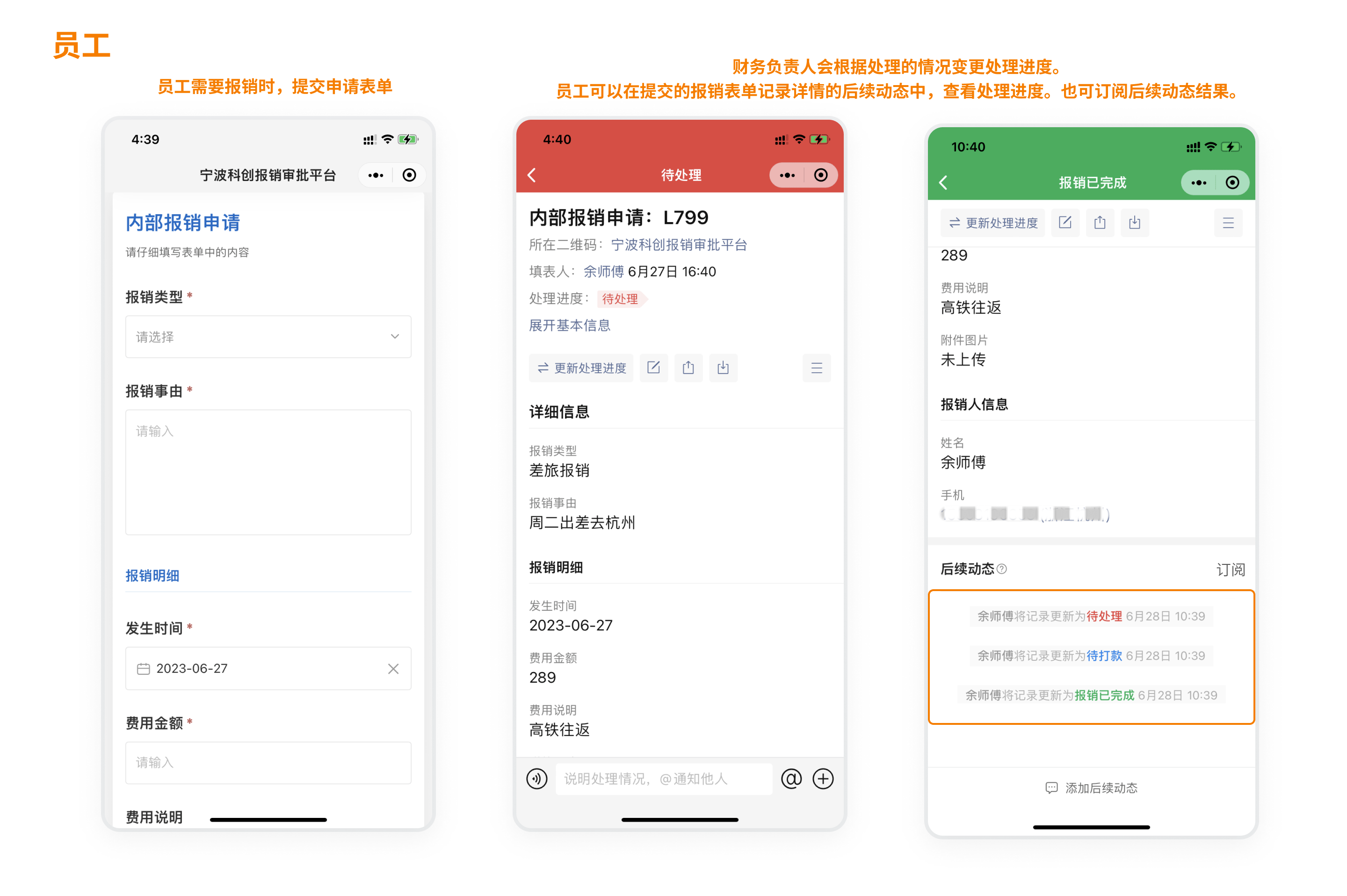 ● 员工可在表单记录详情的后续动态中查看处理进度。也可进行相关订阅,当处理进度发生变更时,会实时发送消息提醒;