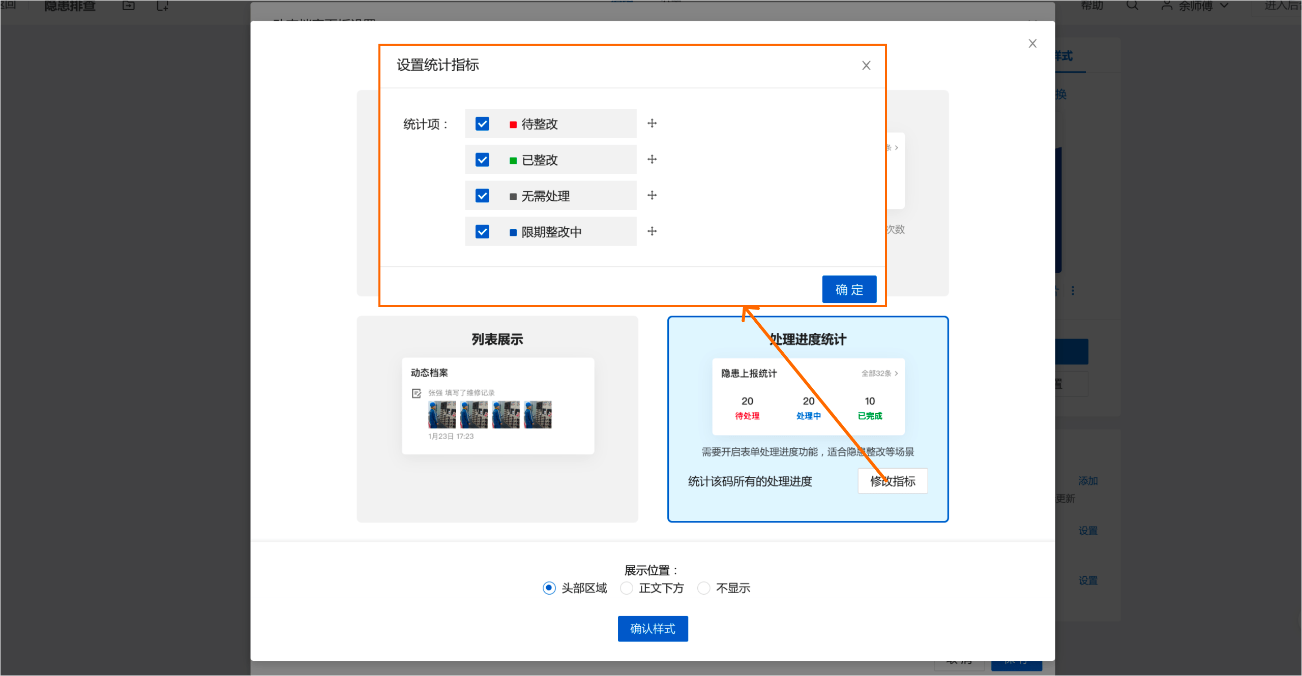 对于动态档案样式面板进行设置,选择处理进度统计。可修改统计指标,将处理进度的统计情况直接展示在二维码上。