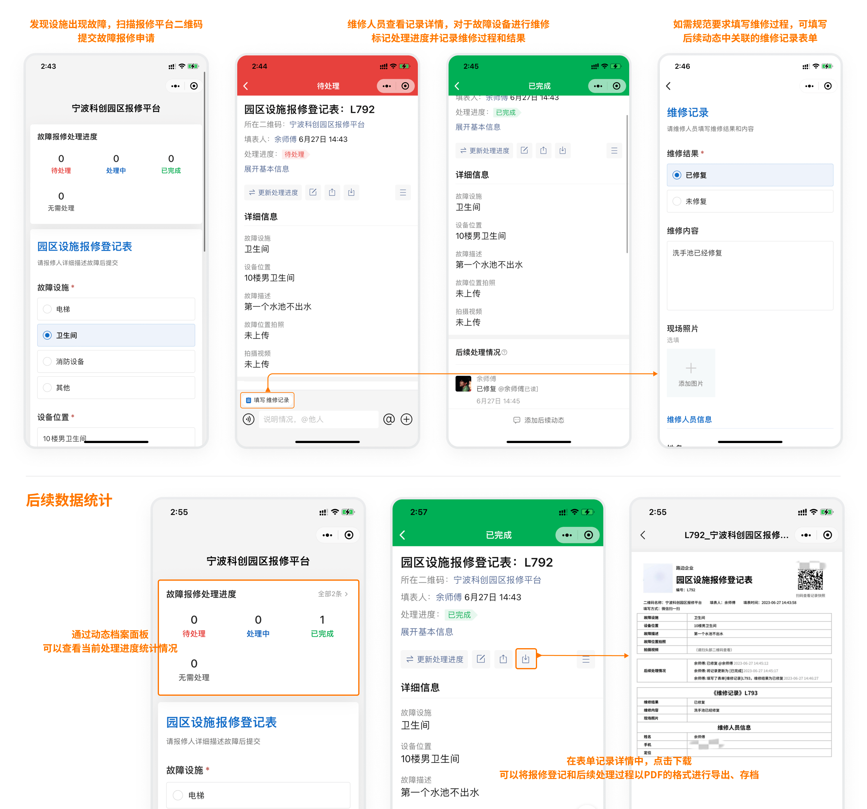 ● 也可以在表单记录详情中,点击下载,将报修登记和维修过程以PDF格式进行导出、存档。