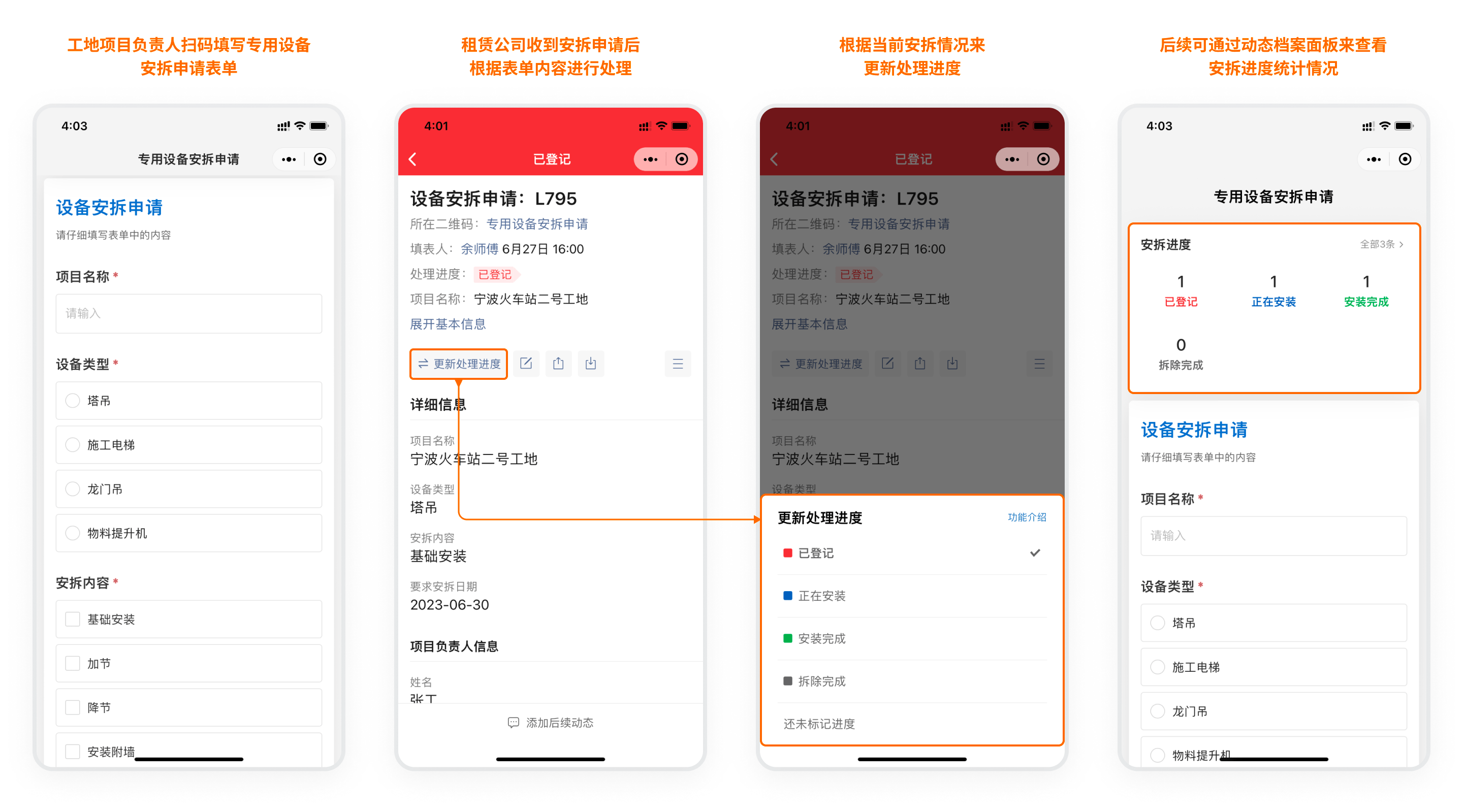 ● 专业设备租赁公司收到安拆申请后,根据表单内容安排人员进行处理;