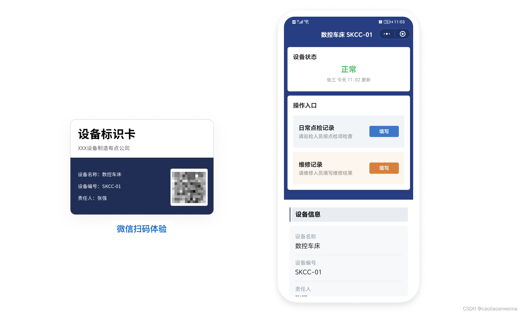 - 一线操作人员不需要专门培训,扫码进行巡检、维修、保养、故障上报、使用登记等操作,会用微信就会用。