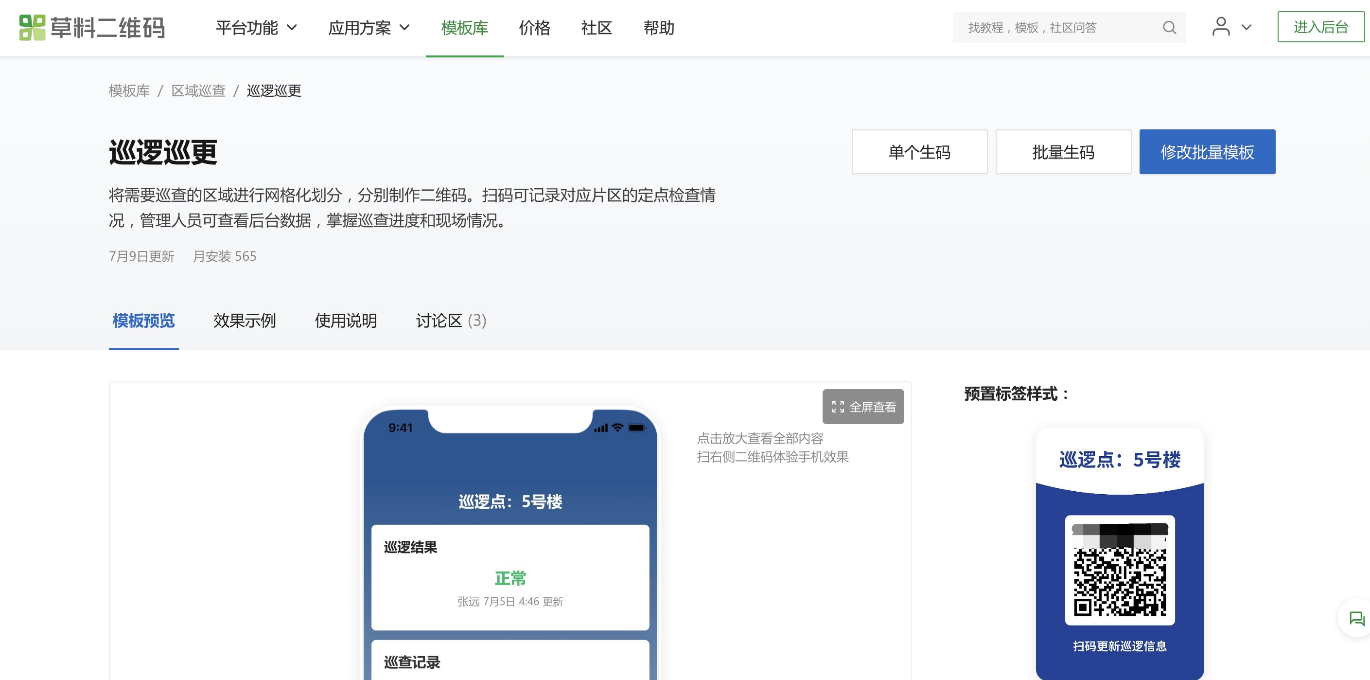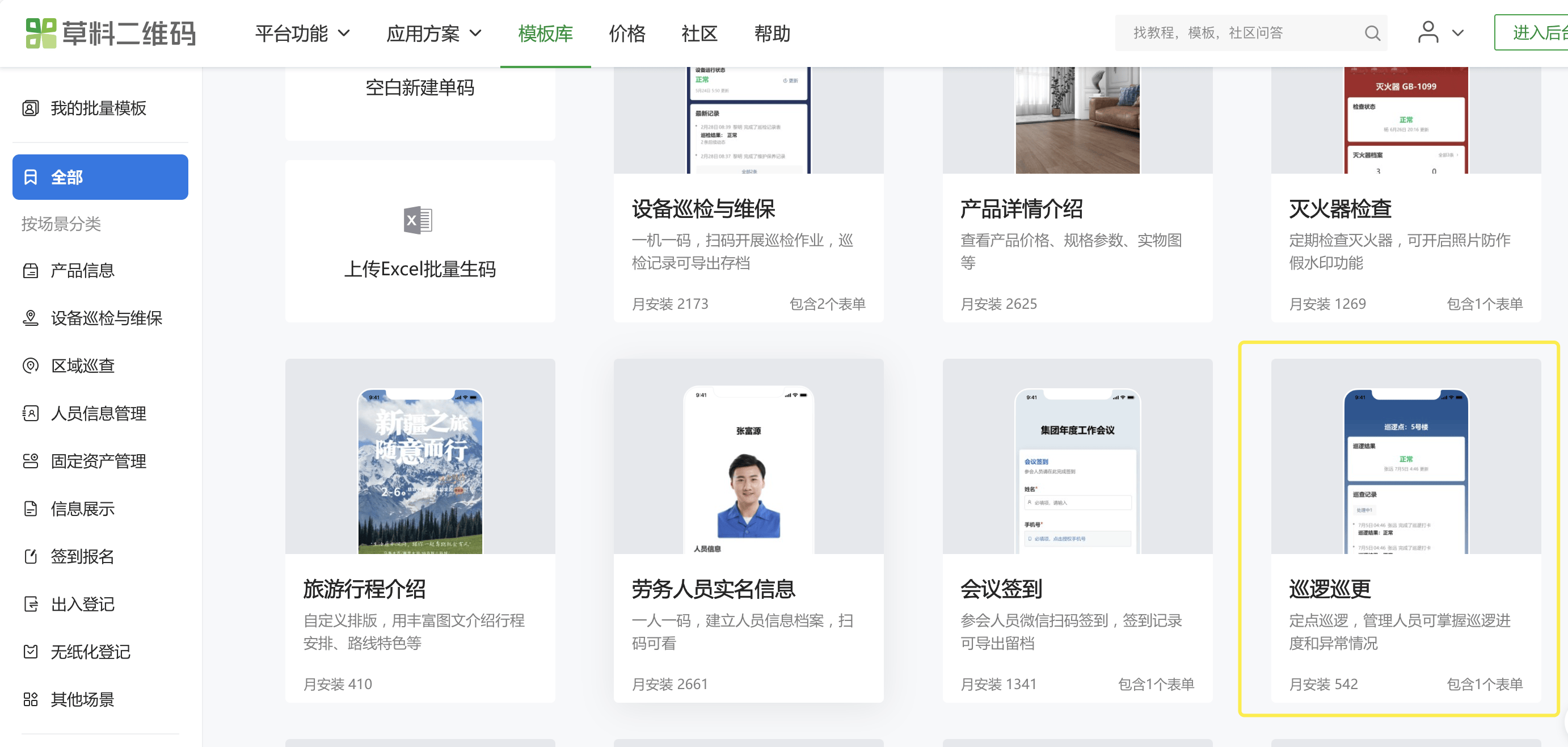 2、在模板库中找到【巡逻巡更】模板,点击立即使用。