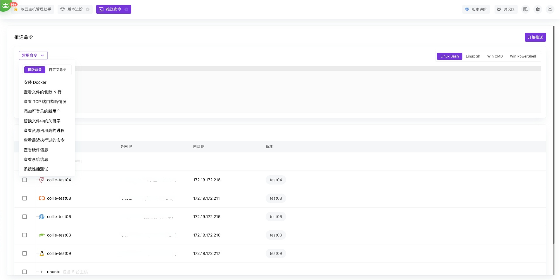 如需对这些服务器批量的进行命令推送,可以点击页面上方的“推送命令”按钮,即可选择内置的模板或自定义命令,批量地对需要执行这些命令的主机进行推送。