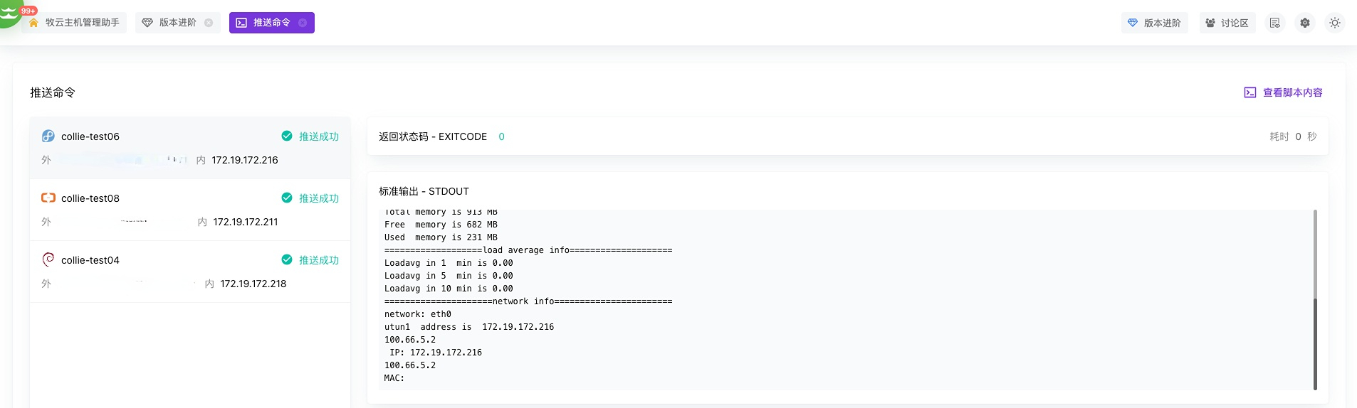 推送完成可查看不同主机的输出情况,会返回命令执行状态码,提供标准输出和错误输出,便于排查服务器命令执行情况。快捷方便的实现了规模化管理服务器,节省了逐台服务器检查的繁琐步骤。