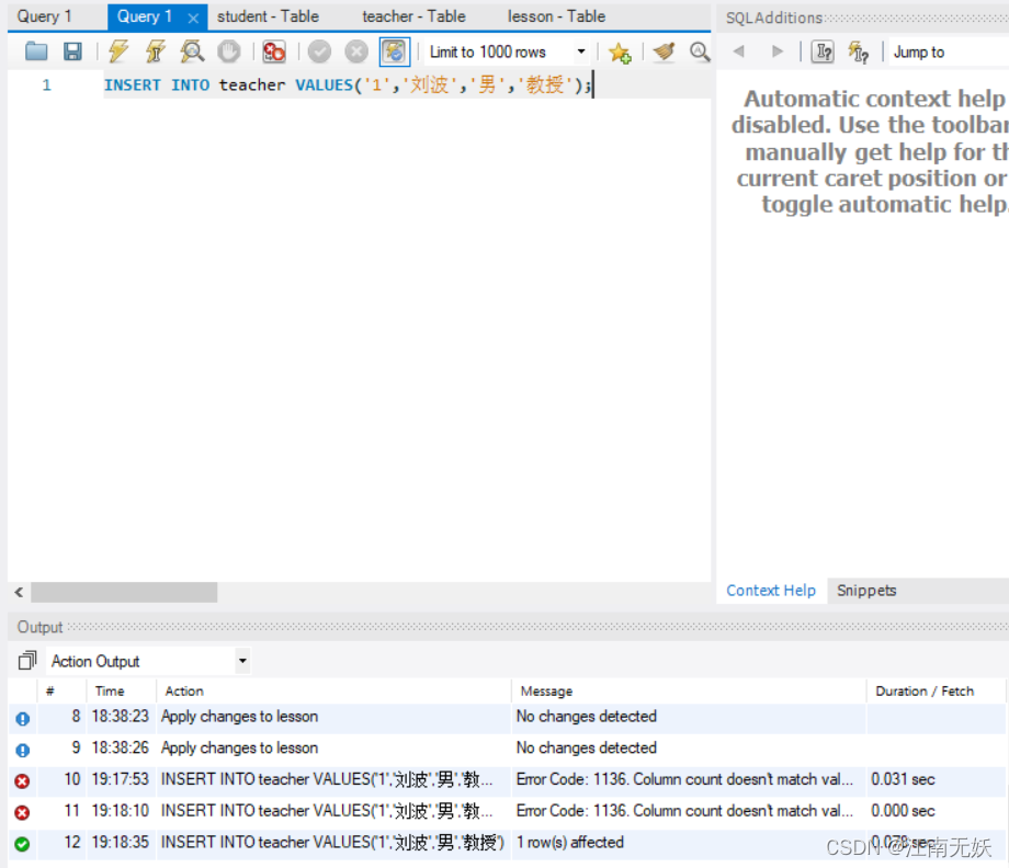 3. 在教师表中添加任意一条数据,然后添加类型为char(2)的‘sex‘字段,该字段不能为空,默认值为“m”,添加是否成功,如果失败分析失败的原因并进行必要的操作使‘sex’字段添加成功;