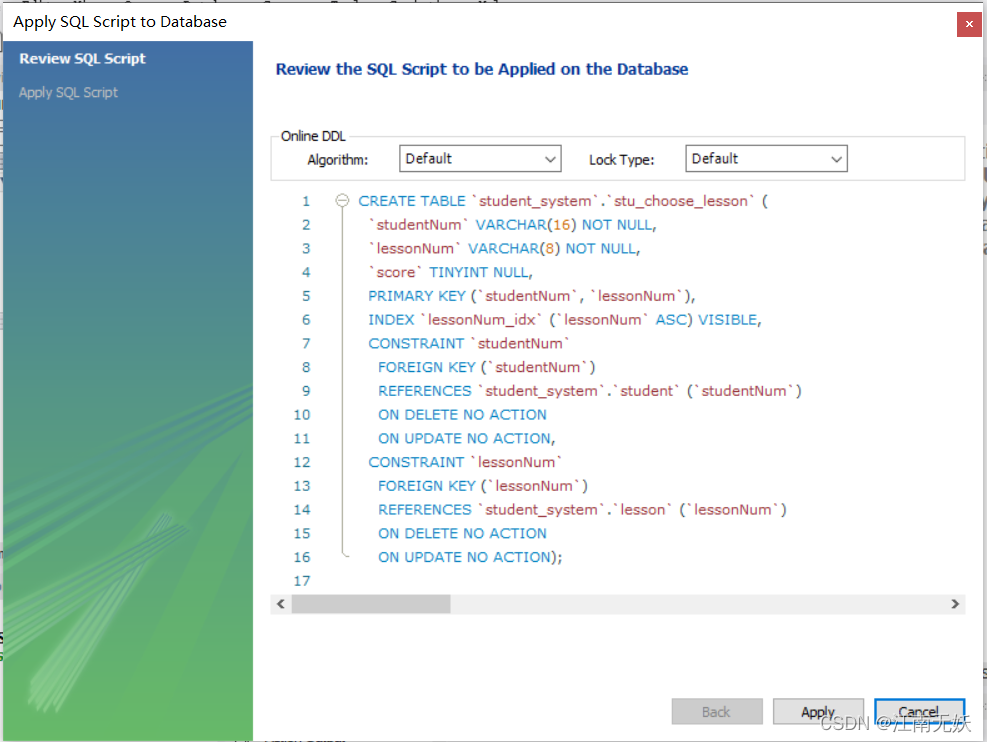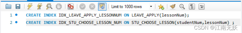 - 在请假单表上为lessonNum列创建索引;在学生选课表中依据“studentNum”和“lessonNum”字段创建索引;