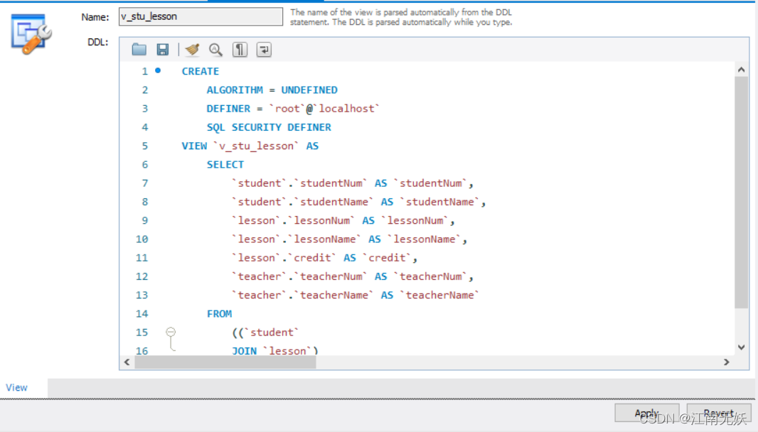 - 创建学生选课视图v_stu_lesson,字段包括学号、学生姓名、课程号、课程名称、学分、任课教师工号、任课教师姓名;