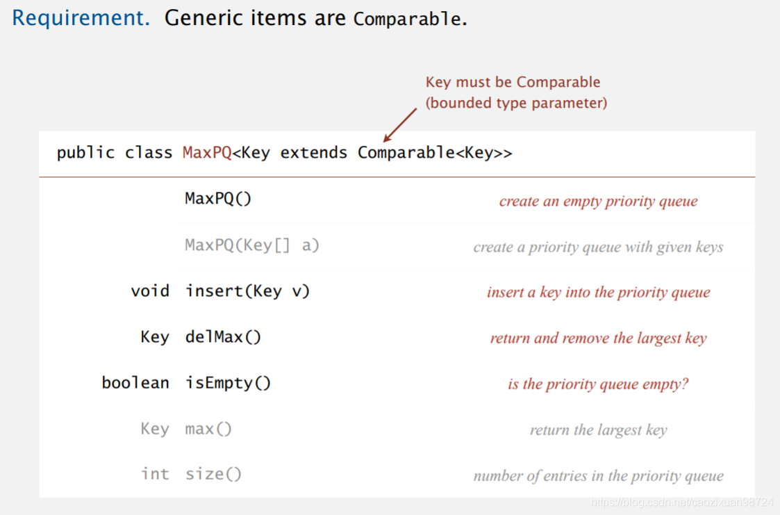这个优先权队列的API还是十分好理解的,无非就是插入元素和删除元素。