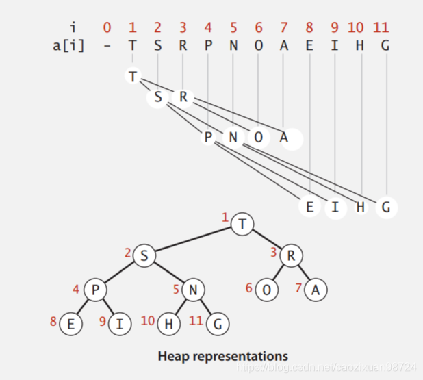 节点从数组下标为1的位置开始(不使用0),对于下标为k的点,其父节点为k/2,子节点为2k和2k+1.