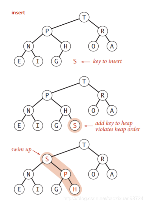 如果所示,我们只要把要插入的元素放到最后,然后使用上浮操作,即可完成。
