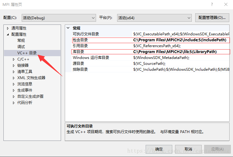 2)在vs中新建C++项目,打开新建项目的属性,找到VC++目录,依次编辑包含目录添加include文件夹路径,编辑库目录添加lib文件夹路径