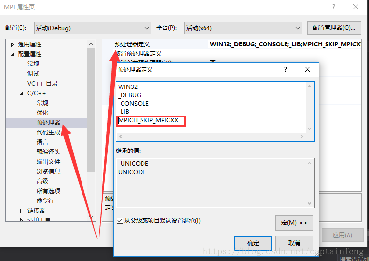 3)选择C/C++,找到预处理器,在预处理器定义里添加MPICH_SKIP_MPICXX,找到代码生成,在运行库选择多线程调试DLL