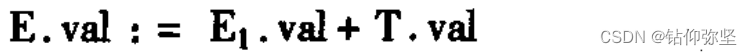 再考虑关于产生式E→E1+T的结点。这个结点的属性T.val的值由下面的语义规则确定: