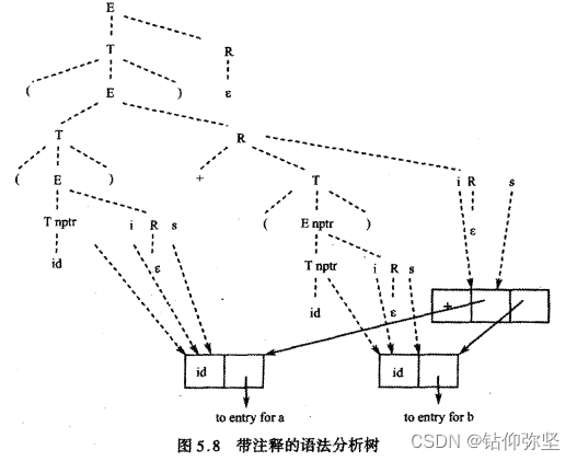 按如图6.17所示的翻译模式,表达式((a)+(b))带注释的语法分析树如图5.8所示。为了使图清晰,省略了部分节点的nptr、s和i属性在图中的表示。