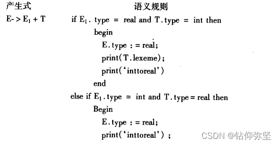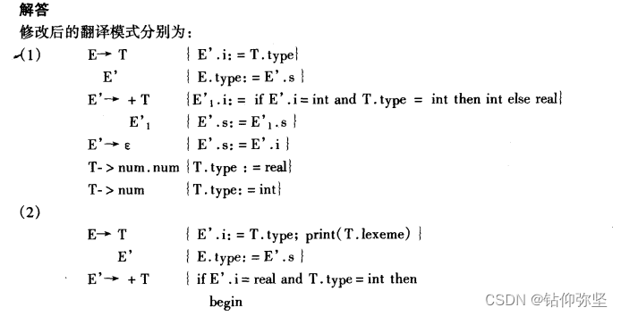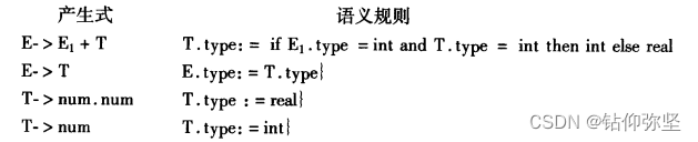 (1)为文法符号E和T配以综合属性type,用来表示它们的类型。类型值分别用int和real来表示。确定每个子表达式结果类型的属性文法如下: