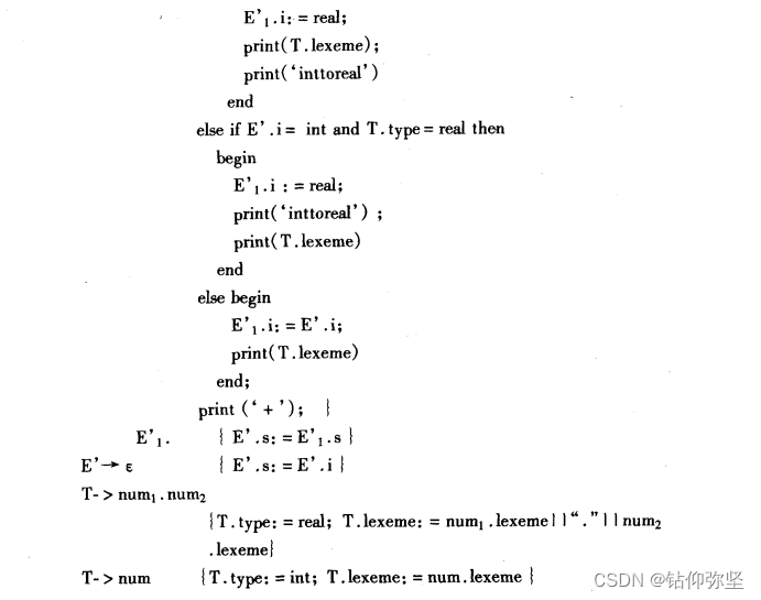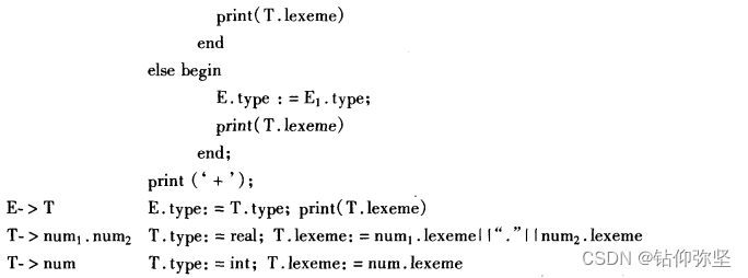 答:确定每个子表达式结果类型的属性文法是比较容易定义的。关键是如何扩充此属性文法,使之把表达式翻译成后缀形式。我们将不在name或num.num向T归约的时候输出该运算对象,而是把运算对象的输出放在T或E+T向E归约的时候。这是因为考虑输出类型转换算符inttoreal的动作可能在E+T向E归约的时候进行,如果这时两个运算对象都在前面name或num.num向T归约的时候已输出,需要为第1个运算对象输出类型转换算符时就已经为时太晚。