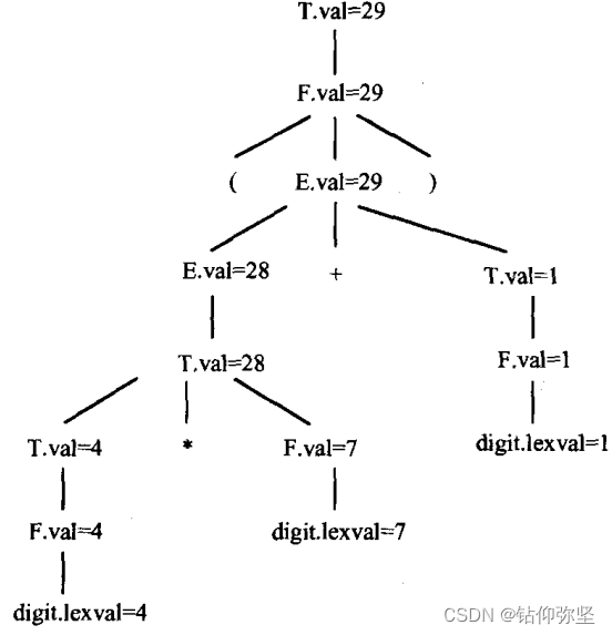 首先考虑最底最左边的内部结点,它对应于产生式F→digit,相应的语义规则为F. val: = digit.lexval,由于这个结点的子结点digit的属性digit . lexval的值为4,所以决定了结点F的属性F.val的值也为4。同样,在F.结点的父结点处,属性T.val的值也算得为4。