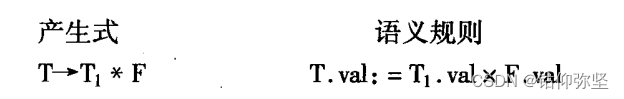再考虑关于产生式T→T1*F的结点。这个结点的属性T.val的值由下面的语义规则确定: